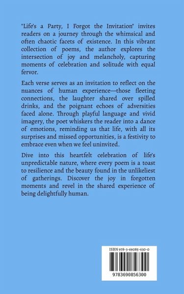 "Life's a Party, I Forgot the Invitation" invites readers on a journey through the whimsical and often chaotic facets of existence. In this vibrant collection of poems, the author explores the intersection of joy and melancholy, capturing moments of celebration and solitude with equal fervor. Each verse serves as an invitation to reflect on the nuances of human experience-those fleeting connections, the laughter shared over spilled drinks, and the poignant echoes of adversities faced alone. Through playful language and vivid imagery, the poet whiskers the reader into a dance of emotions, reminding us that life, with all its surprises and missed opportunities, is a festivity to embrace even when we feel uninvited. Dive into this heartfelt celebration of life's unpredictable nature, where every poem is a toast to resilience and the beauty found in the unlikeliest of gatherings. Discover the joy in forgotten moments and revel in the shared experience of being delightfully human.