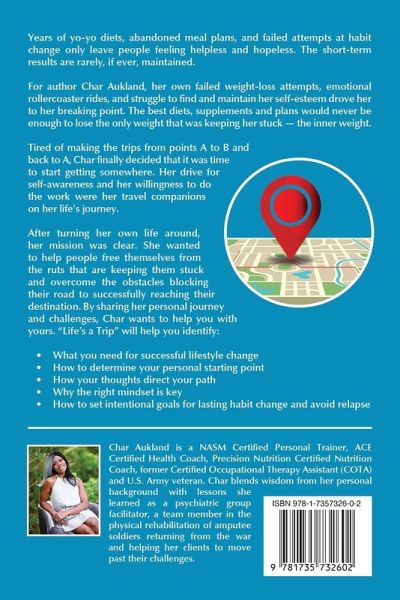 Years of yo-yo diets, abandoned meal plans, and failed attempts at habit change only leave people feeling helpless and hopeless. The short-term results are rarely, if ever, maintained. For author Char Aukland, her own failed weight-loss attempts, emotional rollercoaster rides, and struggle to find and maintain her self-esteem drove her to her breaking point. The best diets, supplements, and plans would never be enough to lose the only weight that was keeping her stuck - the inner weight. Tired of making the trips from points A to B and back to A, Char finally decided that it was time to start getting somewhere. Her drive for self-awareness and her willingness to do the work were her travel companions on her life's journey. After turning her own life around, her mission was clear. She wanted to help people free themselves from the ruts that are keeping them stuck and overcome the obstacles blocking their road to successfully reaching their destination. By sharing her personal journey and challenges, Char wants to help you with yours. "Life's a Trip" will help you identify: - What you need for successful lifestyle change - How to determine your personal starting point - How your thoughts direct your path - Why the right mindset is key - How to set intentional goals for lasting habit change and avoid relapse