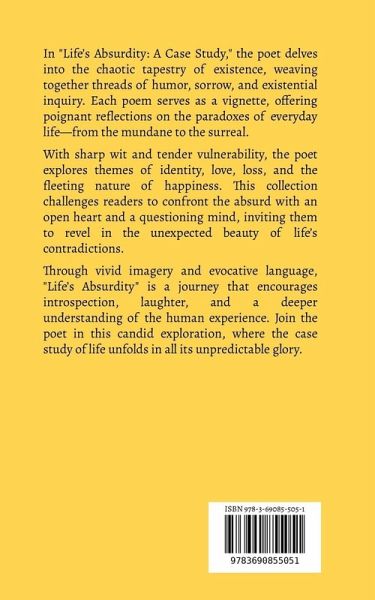In "Life's Absurdity: A Case Study," the poet delves into the chaotic tapestry of existence, weaving together threads of humor, sorrow, and existential inquiry. Each poem serves as a vignette, offering poignant reflections on the paradoxes of everyday life-from the mundane to the surreal. With sharp wit and tender vulnerability, the poet explores themes of identity, love, loss, and the fleeting nature of happiness. This collection challenges readers to confront the absurd with an open heart and a questioning mind, inviting them to revel in the unexpected beauty of life's contradictions. Through vivid imagery and evocative language, "Life's Absurdity" is a journey that encourages introspection, laughter, and a deeper understanding of the human experience. Join the poet in this candid exploration, where the case study of life unfolds in all its unpredictable glory.
