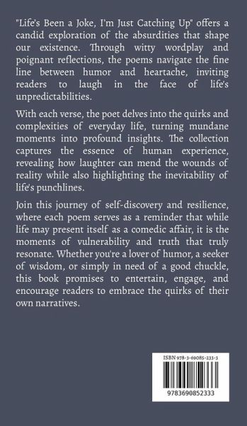 "Life's Been a Joke, I'm Just Catching Up" offers a candid exploration of the absurdities that shape our existence. Through witty wordplay and poignant reflections, the poems navigate the fine line between humor and heartache, inviting readers to laugh in the face of life's unpredictabilities. With each verse, the poet delves into the quirks and complexities of everyday life, turning mundane moments into profound insights. The collection captures the essence of human experience, revealing how laughter can mend the wounds of reality while also highlighting the inevitability of life's punchlines. Join this journey of self-discovery and resilience, where each poem serves as a reminder that while life may present itself as a comedic affair, it is the moments of vulnerability and truth that truly resonate. Whether you're a lover of humor, a seeker of wisdom, or simply in need of a good chuckle, this book promises to entertain, engage, and encourage readers to embrace the quirks of their own narratives.