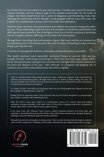 Titow is a versatile author whose literary repertoire spans a wide array of genres, from crime fiction to self-help and international politics. Through works such as A Matter of Faith, Settling The Score, The Chosen, and Black Heart of China, Titow showcases his exceptional storytelling ability and his commitment to exploring diverse themes and subjects.In A Matter of Faith, Titow delves into theological reflections, providing insights into religious doctrine and the challenges of applying faith in daily life. Settling The Score captivates readers with its dramatic tale of survival and redemption as a young designer faces ruthless criminals while rebuilding her life.With The Chosen, Titow takes readers on a transformative journey of a former crime lord seeking redemption through spirituality, while Black Heart of China offers a gripping exploration of geopolitics, human rights abuses, and the fight for justice against tyranny.In his latest work, Life's Dilemma, Titow weaves a deeply emotional narrative of survival, faith, and redemption, chronicling the journey of Sue Pulsar as she confronts her traumatic past, navigates dangerous challenges, and seeks healing through love, family, and belief.Through his powerful and thought-provoking stories, Titow not only entertains but also inspires readers to reflect on life's complexities, challenges, and triumphs, offering hope and enlightenment with every page.