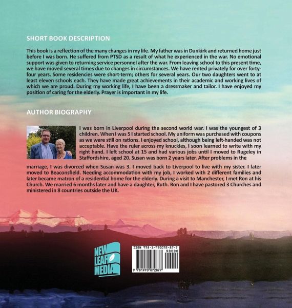 This book is a reflection of the many changes in my life. My father was in Dunkirk and returned home just before I was born. He suffered from PTSD as a result of what he experienced in the war. No emotional support was given to returning service personnel after the war. From leaving school to this present time, we have moved several times due to changes in circumstances. We have rented privately for over fortyfour years. Some residencies were short-term; others for several years. Our two daughters went to atleast eleven schools each. They have made great achievements in their academic and working lives of which we are proud. During my working life, I have been a dressmaker and tailor. I have enjoyed my position of caring for the elderly. Prayer is important in my life.