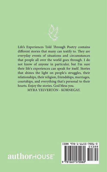 Life's Experiences Told Through Poetry contains different stories that many can testify to. They are everyday events of situations and circumstances that people all over the world goes through. I do not know of anyone in particular, but I'm sure their life's experiences can speak for itself. Stories that shines the light on people's struggles, their relationships, their religion, friendships, marriages, courtships, and everything that's personal to their hearts. Enjoy the stories. God bless you. MYRA YELVERTON - KORNEGAY.