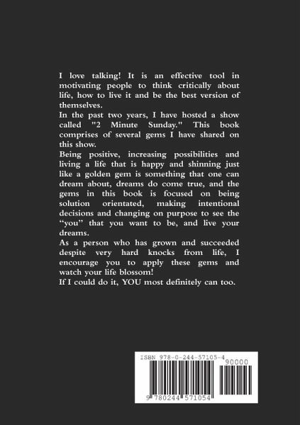 I love talking! It is an effective tool in motivating people to think critically about life, how to live it and be the best version of themselves. In the past two years, I have hosted a show called "2 Minute Sunday." This book comprises of several gems I have shared on this show. Being positive, increasing possibilities and living a life that is happy and shinning just like a golden gem is something that one can dream about, dreams do come true, and the gems in this book is focused on being solution orientated, making intentional decisions and changing on purpose to see the "you" that you want to be, and live your dreams. As a person who has grown and succeeded despite very hard knocks from life, I encourage you to apply these gems and watch your life blossom! If I could do it, YOU most definitely can too.