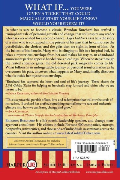 "Find my coat," she whispered weakly. "There's an envelope in the pocket. Don't open it. Take it to the park. You remember the rumors." In what is sure to become a classic, Brendon Burchard has crafted a triumphant tale of personal growth and change that will inspire any reader who has ever wished for a second chance. Life's Golden Ticket tells the story of a man who is so trapped in the prisons of his past that he cannot see the possibilities, the choices, and the gifts that are right in front of him. At the behest of his fiancee, Mary, who is clinging to life in a hospital bed, he takes a mysterious envelope from her and makes his way to an abandoned amusement park to appease her delirious pleadings. When he steps through the rusted entrance gates, the deserted park magically comes to life. He soon meets an old, wise groundskeeper and together they set out to uncover what happened to Mary. Along the way, he encounters a number of caring yet confrontational park employees a hypnotist, a fortune-teller, a lion tamer, high-wire performers and they teach him more about his fiancee and himself than he bargained for. What follows is an unforgettable journey of personal transformation as he overcomes his past, uncovers what happened to Mary, and, finally, discovers what is inside her mysterious envelope. The author is donating a portion of the proceeds from the sale of this book to Kiwanis International, Junior Achievement, and the YMCA. "