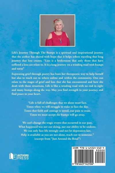 Life's Journey Through The Bumps is a spiritual and inspirational journey that the author has shared with hope that it helps others traveling that long journey that loss creates. "Loss is a brokenness that only those that have suffered a loss can relate to. It is a long journey on a winding road with bumps and turns" Expressing grief through poetry has been her therapeutic way to help herself but also to reach out to others online and within the community. One can relate to the stages of grief and loss that she has encountered and how she dealt with those situations. Life is like a winding road with no end in sight and many bumps along the way. May you find strength in your journey and find peace in your heart. "Life is full of challenges that we alone must face. Times when we will struggle to wake to face the day. Times that faith and courage is tested, our pain to erase. Times we must accept the bumps will go away. We can't change the tragic events that occurred in our past, What happened was not our doing, nor our ability to be undone. We can only face life strongly and not let depression last. Help is available as you are not alone, reach out to someone." (excerpt from "Just Around the Bend")