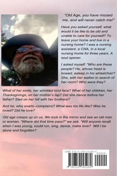 Have you asked yourself, what would it be like to be old and unable to care for yourself? To leave your home and live in a nursing home? I was a nursing assistant, a CNA, in a local nursing home for three years. A soul opener. I asked myself: "Who are these people? He, whose head is bowed, asleep in his wheelchair? She, with her walker in search of her room? Who were they? What of her smile, her wrinkled kind face? What of her children, her Thanksgivings, on her mother's lap? Did she dance before her father? Sled on her hill with her brothers? And he, who snarls--complains? What was his life like? Was he loved? Did he love? Old age creeps up on us. We look in the mirror and see an old man or woman. "Where did that time pass?" we ask. "Will anyone recall when I was young, could run, sing, dance, make love? Will I be alone and forgotten? I invite you to read these stories, a glimpse of the profound depth and mystery of each person.