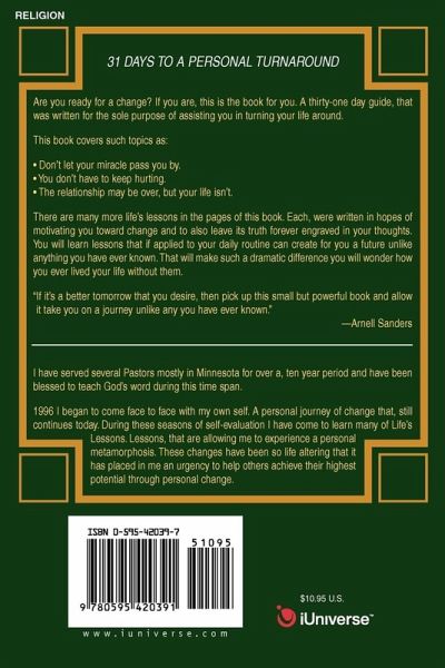 31 DAYS TO A PERSONAL TURNAROUND Are you ready for a change? If you are, this is the book for you. A thirty-one day guide, that was written for the sole purpose of assisting you in turning your life around. This book covers such topics as: Don't let your miracle pass you by. You don't have to keep hurting. The relationship may be over, but your life isn't. There are many more life's lessons in the pages of this book. Each, were written in hopes of motivating you toward change and to also leave its truth forever engraved in your thoughts. You will learn lessons that if applied to your daily routine can create for you a future unlike anything you have ever known. That will make such a dramatic difference you will wonder how you ever lived your life without them. "If it's a better tomorrow that you desire, then pick up this small but powerful book and allow it take you on a journey unlike any you have ever known." Arnell Sanders