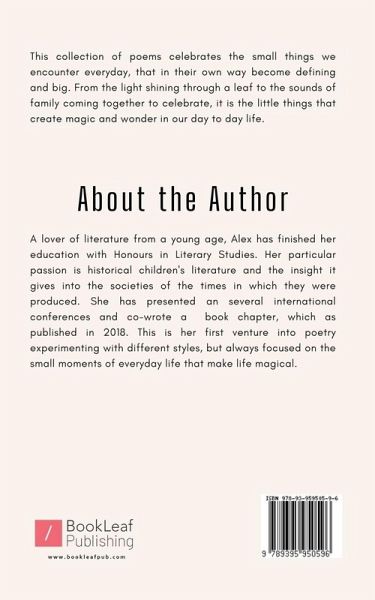 This collection of poems celebrates the small things we encounter everyday, that in their own way become defining and big. From the light shining through a leaf to the sounds of family coming together to celebrate, it is the little things that create magic and wonder in our day to day life.