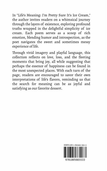 In "Life's Meaning: I'm Pretty Sure It's Ice Cream," the author invites readers on a whimsical journey through the layers of existence, exploring profound truths wrapped in the delightful simplicity of ice cream. Each poem serves as a scoop of rich emotion, blending humor and introspection, as the poet navigates the sweet and sometimes messy experience of life. Through vivid imagery and playful language, this collection reflects on love, loss, and the fleeting moments that bring joy, all while suggesting that perhaps the essence of happiness can be found in the most unexpected places. With each turn of the page, readers are encouraged to savor their own interpretations of life's flavors, reminding us that the search for meaning can be as joyful and satisfying as our favorite dessert.