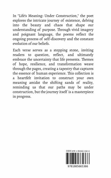 In "Life's Meaning: Under Construction," the poet explores the intricate journey of existence, delving into the beauty and chaos that shape our understanding of purpose. Through vivid imagery and poignant language, the poems reflect the ongoing process of self-discovery and the constant evolution of our beliefs. Each verse serves as a stepping stone, inviting readers to question, reflect, and ultimately embrace the uncertainty that life presents. Themes of hope, resilience, and transformation weave through the pages, creating a tapestry that captures the essence of human experience. This collection is a heartfelt invitation to construct your own meaning amidst the shifting sands of reality, reminding us that our paths may be under construction, but the journey itself is a masterpiece in progress.