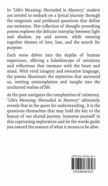 In "Life's Meaning: Shrouded in Mystery," readers are invited to embark on a lyrical journey through the enigmatic and profound questions that define our existence. This collection of thought-provoking poems explores the delicate interplay between light and shadow, joy and sorrow, while weaving together themes of love, loss, and the search for purpose. Each verse delves into the depths of human experience, offering a kaleidoscope of emotions and reflections that resonate with the heart and mind. With vivid imagery and evocative language, the poems illuminate the mysteries that surround us, inviting contemplation and insight into the uncharted realms of life. As the poet navigates the complexities of existence, "Life's Meaning: Shrouded in Mystery" ultimately reveals that in the quest for understanding, it is the questions themselves that may hold the key to the beauty of our shared journey. Immerse yourself in this captivating exploration and let the words guide you toward the essence of what it means to be alive.