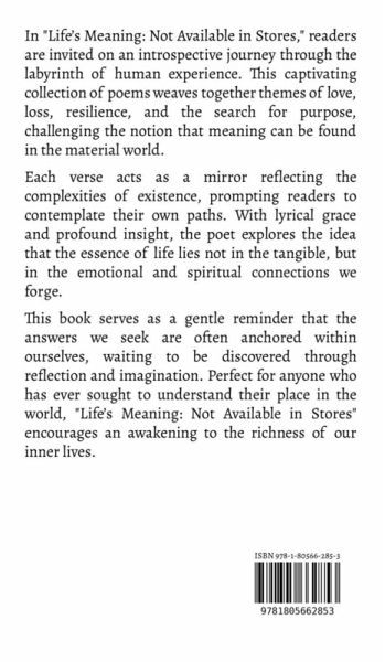 In "Life's Meaning: Not Available in Stores," readers are invited on an introspective journey through the labyrinth of human experience. This captivating collection of poems weaves together themes of love, loss, resilience, and the search for purpose, challenging the notion that meaning can be found in the material world. Each verse acts as a mirror reflecting the complexities of existence, prompting readers to contemplate their own paths. With lyrical grace and profound insight, the poet explores the idea that the essence of life lies not in the tangible, but in the emotional and spiritual connections we forge. This book serves as a gentle reminder that the answers we seek are often anchored within ourselves, waiting to be discovered through reflection and imagination. Perfect for anyone who has ever sought to understand their place in the world, "Life's Meaning: Not Available in Stores" encourages an awakening to the richness of our inner lives.