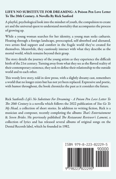 LIFE'S NO SUBSTITUTE FOR DREAMING A Poison Pen Love Letter To The 20th Century A Novella By Rick Sanford A playful, psychological look into the mindset of youth, the compulsion to create art and the universal quest to understand mortality that accompanies the process of growing up. While a young woman searches for her identity, a young man seeks catharsis. Floating through a foreign landscape, preoccupied, self-absorbed and alienated, two artists find support and comfort in the fragile world they've created for themselves. Meanwhile, they cautiously interact with what they describe as the mortal world, which remains beyond their grasp. The story details the journey of the young artists as they experience the difficult birth of the 21st century. Turning away from what they see as the flawed reality of their contemporary existence, they seek to define their relationship to the outside world and to each other. This wordy love story, told in slow prose, with a slightly dreamy cast, remembers a world that no longer exists but has not yet been replaced. Expressive and poetic, with humor throughout, the book chronicles the past as it considers the future.