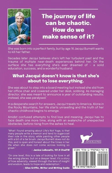 Life's Not Yoga: A Memoir is the story of one woman's journey as she travels through America to make sense of her multiple traumas. She was born into a perfect family, but by age 16 Jacqui Burnett wants to kill her father. Decades later Jacqui believes she's left her turbulent childhood past and the trauma of multiple near-death experiences behind her. On the surface, she has everything she's ever dreamed of - a solid education, success, and a wonderful husband. What Jacqui doesn't know is that she's about to lose everything. She was about to step into a board meeting but instead she slid from her office chair and cowered under her desk, sobbing. As managing director, she was meant to announce a year of outstanding results; instead, she was paralysed.' In a desperate search for answers, Jacqui travels to America. Alone in the Rocky Mountains, her life starts unravelling and the truth of her chaotic childhood begins to emerge. Amidst confused attempts to find love and meaning, Jacqui has to face death one more time, along with an avalanche of unexpected obstacles, before rising from the ashes to heal. This memoir is for anyone who has battled with emotional abuse, financial loss, depression, heartbreak, divorce, burnout, PTSD, anxiety, or fibromyalgia, looking for understanding on how to heal themselves.