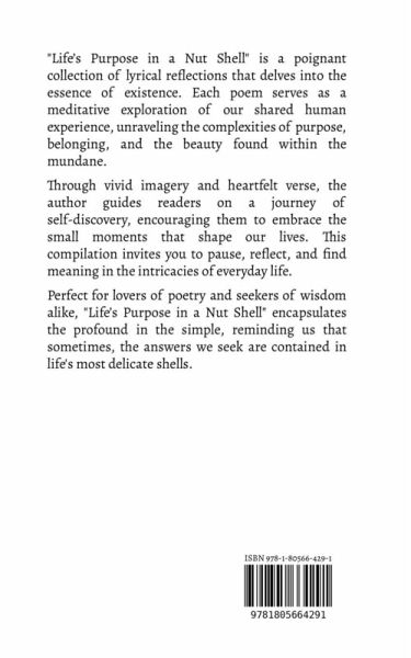 "Life's Purpose in a Nut Shell" is a poignant collection of lyrical reflections that delves into the essence of existence. Each poem serves as a meditative exploration of our shared human experience, unraveling the complexities of purpose, belonging, and the beauty found within the mundane. Through vivid imagery and heartfelt verse, the author guides readers on a journey of self-discovery, encouraging them to embrace the small moments that shape our lives. This compilation invites you to pause, reflect, and find meaning in the intricacies of everyday life. Perfect for lovers of poetry and seekers of wisdom alike, "Life's Purpose in a Nut Shell" encapsulates the profound in the simple, reminding us that sometimes, the answers we seek are contained in life's most delicate shells.