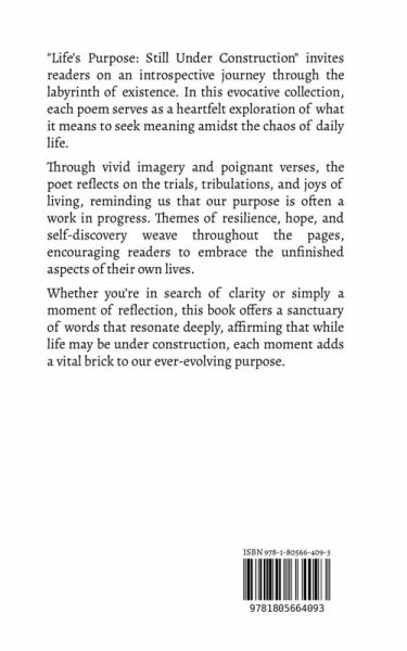 "Life's Purpose: Still Under Construction" invites readers on an introspective journey through the labyrinth of existence. In this evocative collection, each poem serves as a heartfelt exploration of what it means to seek meaning amidst the chaos of daily life. Through vivid imagery and poignant verses, the poet reflects on the trials, tribulations, and joys of living, reminding us that our purpose is often a work in progress. Themes of resilience, hope, and self-discovery weave throughout the pages, encouraging readers to embrace the unfinished aspects of their own lives. Whether you're in search of clarity or simply a moment of reflection, this book offers a sanctuary of words that resonate deeply, affirming that while life may be under construction, each moment adds a vital brick to our ever-evolving purpose.