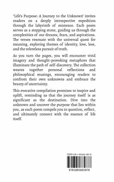 "Life's Purpose: A Journey to the Unknown" invites readers on a deeply introspective expedition through the labyrinth of existence. Each poem serves as a stepping stone, guiding us through the complexities of our dreams, fears, and aspirations. The verses resonate with the universal quest for meaning, exploring themes of identity, love, loss, and the relentless pursuit of truth. As you turn the pages, you will encounter vivid imagery and thought-provoking metaphors that illuminate the path of self-discovery. The collection weaves together personal reflections and philosophical musings, encouraging readers to confront their own unknowns and embrace the beauty of uncertainty. This evocative compilation promises to inspire and uplift, reminding us that the journey itself is as significant as the destination. Dive into the unknown and uncover the purpose that lies within you, as each poem compels you to question, reflect, and ultimately connect with the essence of life itself.
