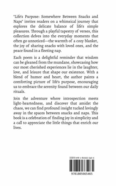 "Life's Purpose: Somewhere Between Snacks and Naps" invites readers on a whimsical journey that explores the delicate balance of life's simple pleasures. Through a playful tapestry of verses, this collection delves into the everyday moments that often go unnoticed-the warmth of a cozy blanket, the joy of sharing snacks with loved ones, and the peace found in a fleeting nap. Each poem is a delightful reminder that wisdom can be gleaned from the mundane, showcasing how our most cherished experiences lie in the laughter, love, and leisure that shape our existence. With a blend of humor and heart, the author paints a comforting picture of life's purpose, encouraging us to embrace the serenity found between our daily rituals. Join the adventure where introspection meets light-heartedness, and discover that amidst the chaos, we can find profound insight tucked lovingly away in the spaces between snacks and naps. This book is a celebration of finding joy in simplicity and a call to appreciate the little things that enrich our lives.