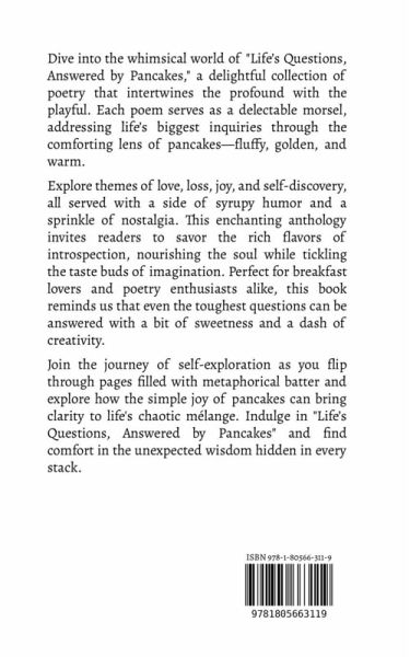 Dive into the whimsical world of "Life's Questions, Answered by Pancakes," a delightful collection of poetry that intertwines the profound with the playful. Each poem serves as a delectable morsel, addressing life's biggest inquiries through the comforting lens of pancakes-fluffy, golden, and warm. Explore themes of love, loss, joy, and self-discovery, all served with a side of syrupy humor and a sprinkle of nostalgia. This enchanting anthology invites readers to savor the rich flavors of introspection, nourishing the soul while tickling the taste buds of imagination. Perfect for breakfast lovers and poetry enthusiasts alike, this book reminds us that even the toughest questions can be answered with a bit of sweetness and a dash of creativity. Join the journey of self-exploration as you flip through pages filled with metaphorical batter and explore how the simple joy of pancakes can bring clarity to life's chaotic mélange. Indulge in "Life's Questions, Answered by Pancakes" and find comfort in the unexpected wisdom hidden in every stack.