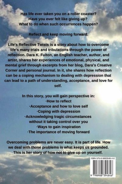 Life's Reflective Twists is a story about how to overcome life's many trials and tribulations through the power of reflection. Dara K. Fulton shares her experiences in coping with job loss, breakups, surgeries, and issues with depression. Through reflecting and helping people, Dara has overcome abuse, prejudices, and low self-esteem. Life's Reflective Twists will give readers perspective on how reflection can help you cope with things that affect us physically, emotionally, and mentally. Dara discusses how moving forward, learning to accept and love self will help you gain control over the problems we face.