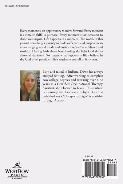 Every moment is an opportunity to move forward. Every moment is a time to fulfill a purpose. Every moment is an occasion to shine and inspire. Life happens in a moment. The words in this journal describing a journey to find God's path and purpose in an ever-changing world inside and outside one's self is unfiltered and truthful. Having faith above fear. Finding the light God shines above all darkness. No matter what happens in life - believe in the God of all possible. Life's roadways are full of left turns.
