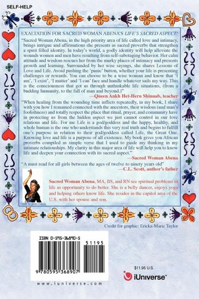 'The affirmations presented here are sacred proverbs that strengthen a spiritfilled identity, helping alleviate wounds that may result from self-sabotaging behavior. Whether life presents one with challenges or with opportunities, you don't have to push the 'panic' button. Our foremothers and fathers had a strong sense of self, indeed they faced unthinkable odds. 'I am,' 'I exist,' 'I matter,' and 'I can' face and heal whatever sails my way was the consciousness that got us through unthinkable life situations (from a budding humanity, to slavery and beyond.)"-Queen Maat Ankh Het-Heru Shinuab 'When healing myself from the wounding time inflicts over and over again, I remain connected with the ancestors, their wisdom (and man's foolishness) and understand the place that ritual, prayer, and ceremonies have in protecting us from the hidden aspects we just can not control in life. For me Life is a god/goddess and the happy, healthy, and whole human is the one who understands this very real truth and begins to fulfill one's purpose in relation to their god/goddess called Life, the Great One. Knowing life is a purpose of all of existence. My books give you African proverbs compiled as simple daily guidelines for knowing life and deepening your connection with its sacred aspect."-Sacred Woman Abena