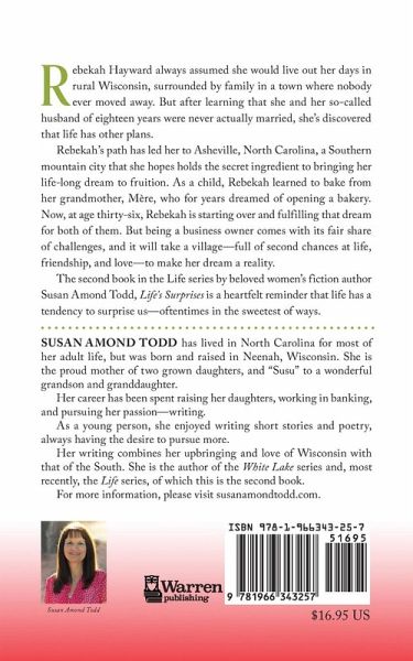 Rebekah Hayward always assumed she would live out her days in rural Wisconsin, surrounded by family in a town where nobody ever moved away. But after learning that she and her so-called husband of eighteen years were never actually married, she's discovered that life has other plans. Rebekah's path has led her to Asheville, North Carolina, a Southern mountain city that she hopes holds the secret ingredient to bringing her life-long dream to fruition. As a child, Rebekah learned to bake from her grandmother, Mère, who for years dreamed of opening a bakery. Now, at age thirty-six, Rebekah is starting over and fulfilling that dream for both of them. But being a business owner comes with its fair share of challenges, and it will take a village-full of second chances at life, friendship, and love-to make her dream a reality. The second book in the Life series by beloved women's fiction author Susan Amond Todd, Life's Surprises is a heartfelt reminder that life has a tendency to surprise us-oftentimes in the sweetest of ways.