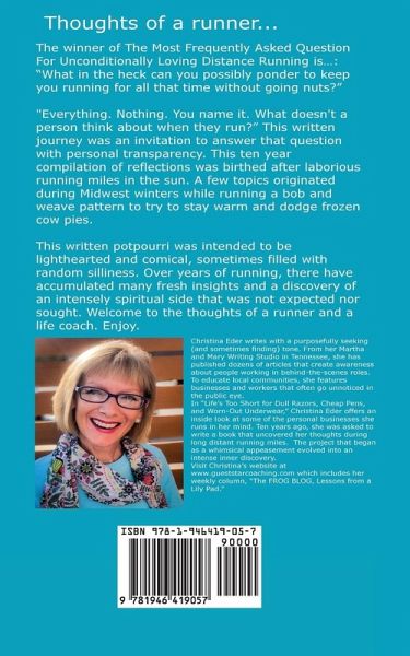 The winner of The Most Frequently Asked Question For Unconditionally Loving Distance Running is…: "What in the heck can you possibly ponder to keep you running for all that time without going nuts?" "Everything. Nothing. You name it. What doesn't a person think about when they run?" This written journey was an invitation to answer that question with personal transparency. This ten year compilation of reflections was birthed after laborious miles running in the sun. A few topics originated during Midwest winters while running a bob and weave pattern to try to stay warm and dodge frozen cow pies. This written potpourri was intended to be lighthearted and comical, sometimes filled with random silliness. Over years of running, there have accumulated many fresh insights and a discovery of an intensely spiritual side that was not expected nor sought. Welcome to the thoughts of a runner and a life coach. Enjoy.