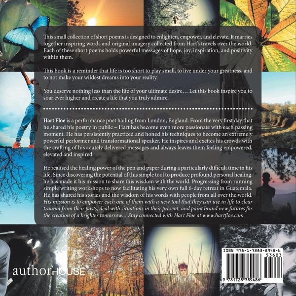 This small collection of short poems is designed to enlighten, empower, and elevate. It marries together inspiring words and original imagery collected from Hart's travels over the world. Each of these short poems holds powerful messages of hope, joy, inspiration, and positivity within them. This book is a reminder that life is too short to play small, to live under your greatness, and to not make your wildest dreams into your reality. You deserve nothing less than the life of your ultimate desire. Let this book inspire you to go and create that life today.