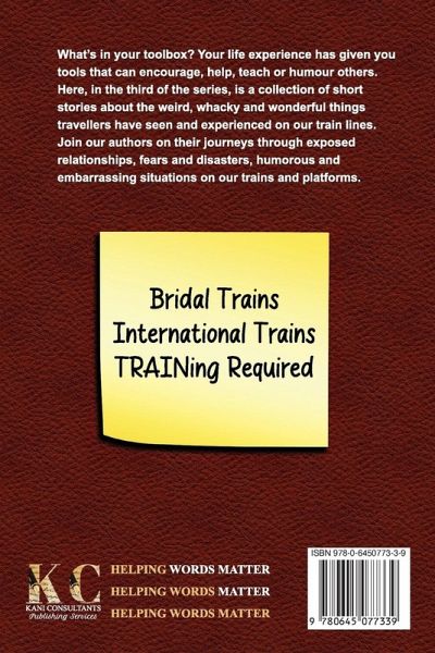 What's in your toolbox? Your life experience has given you tools that can encourage, help, teach or humour others. Here, in the third of the series, is a collection of short stories about the weird, whacky and wonderful things travellers have seen and experienced on our train lines. Join our authors on their journeys through exposed relationships, fears and disasters, humorous and embarrassing situations on our trains and platforms.