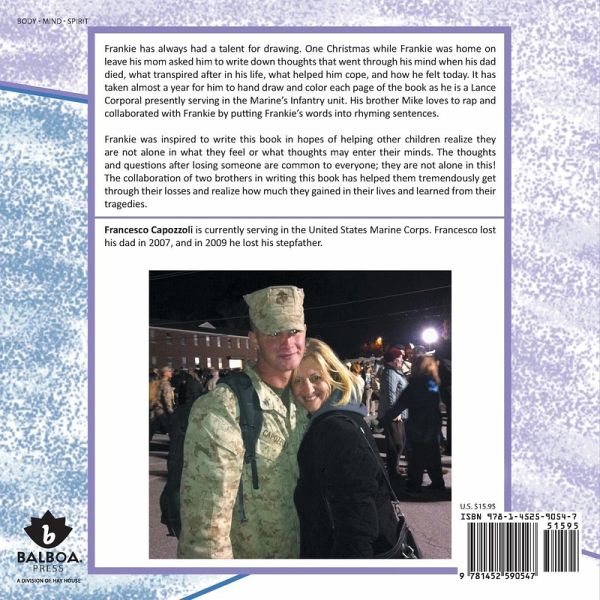 Frankie has always had a talent for drawing. One Christmas while Frankie was home on leave his mom asked him to write down thoughts that went through his mind when his dad died, what transpired after in his life, what helped him cope, and how he felt today. It has taken almost a year for him to hand draw and color each page of the book as he is a Lance Corporal presently serving in the Marine's Infantry unit. His brother Mike loves to rap and collaborated with Frankie by putting Frankie's words into rhyming sentences. Frankie was inspired to write this book in hopes of helping other children realize they are not alone in what they feel or what thoughts may enter their minds. The thoughts and questions after losing someone are common to everyone; they are not alone in this! The collaboration of two brothers in writing this book has helped them tremendously get through their losses and realize how much they gained in their lives and learned from their tragedies.