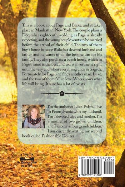 Book synopsis:This is a book about Page and Blake, and it takes place in Manhattan, New York. The couple plans a December eighteenth wedding as Page is already expecting, and the young couple wants to be married before the arrival of their child. The two of them buy a house because Blake is a devoted husband and father, and he wants to do the best he can for his family. They also purchase a beach house, which in Page's mind is the best and worst investment right until the very end when everything ends in tragedy. Fortunately for Page, she finds another man, Luke, and the two of them fall in love. Who knows what life will bring. It sure has a lot of twists. Autobiography: I'm the author of Life's Twists. I live in Pennsylvania with my husband. I'm a devoted wife and mother. I'm a mother of two grown children, and I also have four grandchildren. I am currently writing my second book called Fashionable Desires.