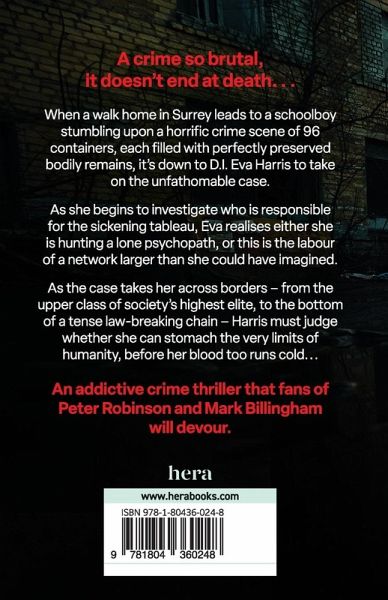 A crime so brutal, it doesn't end at death... When a walk home in Surrey leads to a schoolboy stumbling upon a horrific crime scene of 96 containers, each filled with perfectly preserved bodily remains, it's down to D.I. Eva Harris to take on the unfathomable case. Already haunted by her brush with the criminal underworld, Harris still has fears for her life - and the truth of what really happened being uncovered. But now facing a new crime scene, she is forced to look at her options: either she is hunting a lone psychopath, or this is the labour of a network larger than she could have imagined. As the case takes her across borders - from the upper class of society's highest elite, to the bottom of a tense law-breaking chain - Harris must judge whether she can stomach the very limits of humanity, before her blood too runs cold... A dark, gripping detective novel that fans of Stuart MacBride and M.W. Craven will love. Praise for the D.I. Harris series: 'Puts the thrill in thriller...Definitely one of the best reads of the year.' ¿¿¿¿¿ Reader Review 'Wow!...Strap yourself in, take a deep breath, as you'll be going at warp speed...Intelligently plotted with well-crafted characters. An excellent read.' ¿¿¿¿¿ Reader Review 'Suspenseful and gripping and a terrific page-turner!...I fully recommend it if you enjoy a fast-paced thriller with twists and turns galore!' Reader Review 'A fast paced, exhilarating and really exciting read...will capture the interest of readers right from the first page.' ¿¿¿¿¿ Reader Review 'I absolutely loved it!... gripped me from the start and the pace never let up...I would happily recommend this to crime thriller readers!' Reader Review 'If you want thrills and chills by the bucket load then you seriously can't go wrong with this book...A thrilling read that doesn't let go until the very last page!' Reader Review 'This is a mindbending thriller...I enjoyed it immensely and highly recommend it.' ¿¿¿¿¿ Reader Review 'Unputdownable...I ended up finishing the book in a few hours...Eva is such a great character and very easy to root for.' ¿¿¿¿¿ Reader Review