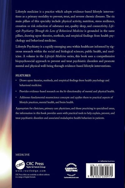Lifestyle medicine is a practice which adopts evidence-based lifestyle interventions as a primary modality to prevent, treat, and reverse chronic diseases. The six main pillars of this specialty include physical activity, nutrition, stress resilience, cessation or risk reduction of substance use, quality sleep, and connectivity. Lifestyle Psychiatry: Through the Lens of Behavioral Medicine is grounded in the same pillars, drawing upon theories, methods, and empirical findings from health psychology and behavioral medicine. Lifestyle psychiatry is a rapidly emerging area within healthcare…mehr