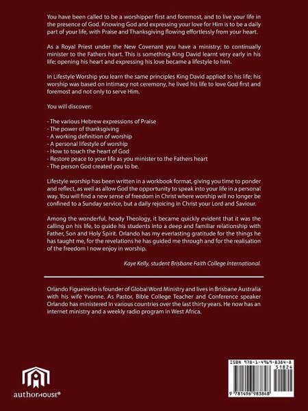 You have been called to be a worshipper first and foremost, and to live your life in the presence of God. Knowing God and expressing your love for Him is to be a daily part of your life, with Praise and Thanksgiving fl owing effortlessly from your heart. As a Royal Priest under the New Covenant you have a ministry; to continually minister to the Fathers heart. This is something King David learnt very early in his life; opening his heart and expressing his love became a lifestyle to him. In Lifestyle Worship you learn the same principles King David applied to his life; his worship was based on intimacy not ceremony, he lived his life to love God first and foremost and not only to serve Him. You will discover: - The various Hebrew expressions of Praise - The power of thanksgiving - A working definition of worship - A personal lifestyle of worship - How to touch the heart of God - Restore peace to your life as you minister to the Fathers heart - The person God created you to be. Lifestyle worship has been written in a workbook format, giving you time to ponder and reflect, as well as allow God the opportunity to speak into your life in a personal way. You will find a new sense of freedom in Christ where worship will no longer be confined to a Sunday service, but a daily rejoicing in Christ your Lord and Saviour. Among the wonderful, heady Theology, it became quickly evident that it was the calling on his life, to guide his students into a deep and familiar relationship with Father, Son and Holy Spirit. Orlando has my everlasting gratitude for the things he has taught me, for the revelations he has guided me through and for the realization of the freedom I now enjoy in worship. Kaye Kelly, student Brisbane Faith College International.