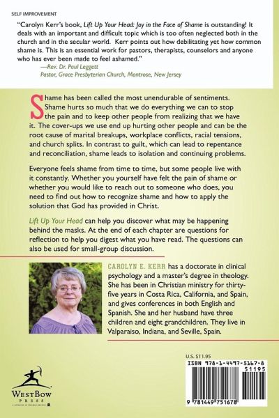 Shame has been called the most unendurable of sentiments. Shame hurts so much that we do everything we can to stop the pain and to keep other people from realizing that we have it. The cover-ups we use end up hurting other people and can be the root cause of marital breakups, workplace conflicts, racial tensions, and church splits. In contrast to guilt, which can lead to repentance and reconciliation, shame leads to isolation and continuing problems. Everyone feels shame from time to time, but some people live with it constantly. Whether you yourself have felt the pain of shame or whether you would like to reach out to someone who does, you need to find out how to recognize shame and how to apply the solution that God has provided in Christ. Lift Up Your Head can help you discover what may be happening behind the masks. At the end of each chapter are questions for reflection to help you digest what you have read. The questions can also be used for small-group discussion. "Carolyn Kerr's book, Lift Up Your Head: Joy in the Face of Shame is outstanding! It deals with an important and difficult topic which is too often neglected both in the church and in the secular world. Kerr points out how debilitating yet how common shame is. This is an essential work for pastors, therapists, counselors and anyone who has ever been made to feel ashamed." -Rev. Dr. Paul Leggett Pastor, Grace Presbyterian Church, Montrose, New Jersey