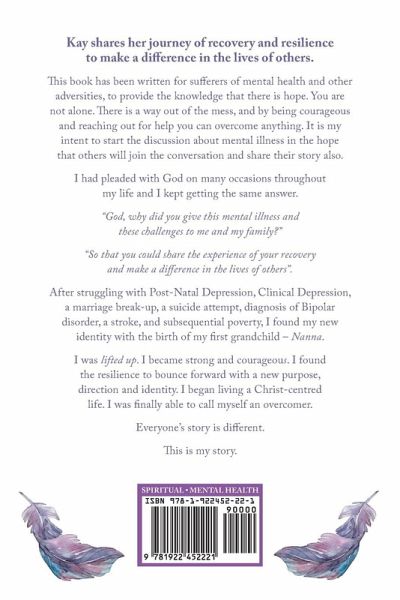 Kay shares her journey of recovery and resilience to make a difference in the lives of others. This book had been rolling around in Kay's head for 30 years. It started formulating one beautiful and dreadful weekend. This is the story of Kay, the young Mum with 3 daughters suffering from a four-year-long Post Natal Depression after the birth of her third child; finding healing on a weekend away by herself of quiet peace and surrender to God. After achieving goals, kicking down barriers and finding her new identity she is provided the opportunity to start a new life of purpose and is able to call herself AN OVERCOMER. Start the conversation about mental illness. A part of the Semi Colon Project.