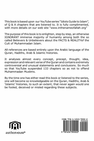 This book is based upon our YouTube series "Idiots Guide to Islam", of Q & A chapters that are listened to. It is fully complimented, with more details on our web site "www.inthenameofallah.org" The purpose of this book is to enlighten, step by step, an otherwise IGNORANT immense majority of humanity among both the so called Believers & Unbelievers about the FACTS & REALITYof the Cult of Muhammadan Islam. All references are based entirely upon the Arabic language of the Quran, Hadiths, Arab & Islamic histories. It analyses almost every concept, precept, thought, idea, expression and relevant verse of the Quran and contains extremely controversial and unusual statements and conclusions. By the time one has either read this book or listened to the series, one will become so knowledgeable on the Quran, Hadiths, Arab & 'Islamic' histories, to such an extent, that never again would one be fooled, deceived or misled regarding these subjects.