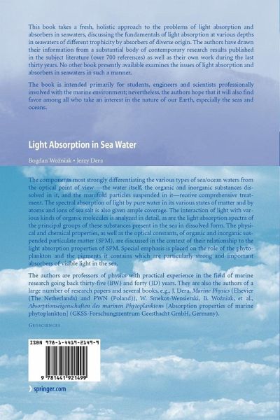 The components most strongly differentiating the various types of sea/ocean waters from the optical point of view the water itself, the organic and inorganic substances dissolved in it, and the manifold particles suspended in it receive comprehensive treatment. The spectral absorption of light by pure water in its various states of matter and by atoms and ions of sea salt is also given ample coverage. The interaction of light with various kinds of organic molecules is analyzed in detail, as are the light absorption spectra of the principal groups of these substances present in the sea in dissolved form. The physical and chemical properties, as well as the optical constants, of organic and inorganic suspended particulate matter (SPM), are discussed in the context of their relationship to the light absorption properties of SPM. Special emphasis is placed on the role of the phytoplankton and the pigments it contains which are particularly strong and important absorbers of visible light in the sea.