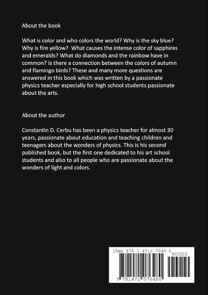 "Light and Color" is a short, educative and entertaining course book about the world of light and color. It can be a quick start for art students who are interested in knowing more. What is color and who colors the world? Why is the sky blue? Why is fire yellow? What causes the intense color of sapphires and emeralds? What do diamonds and the rainbow have in common? Is there a connection between the colors of autumn and flamingo birds? These and many more questions are answered in this book which was written by a passionate physics teacher especially for high school students passionate about the arts. About the author: Constantin D. Cerbu has been a physics teacher for almost 30 years, passionate about education and teaching children and teenagers about the wonders of physics. This is his second published book, but the first one dedicated to his art school students and also to all people who are passionate about the wonders of light and colors.