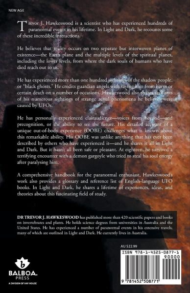 Trevor J. Hawkeswood is a scientist who has experienced hundreds of paranormal events in his lifetime. In Light and Dark, he recounts some of these incredible interactions. He believes that reality occurs on two separate but interwoven planes of existence-the Earth plane and the multiple levels of the spiritual planes, including the lower levels, from where the dark souls of humans who have died reach out to us. He has experienced more than one hundred sightings of the shadow people, or "black ghosts." He credits guardian angels with saving him from harm or certain death on a number of occasions. Hawkeswood also shares accounts of his numerous sightings of strange aerial phenomena he believes were caused by UFOs. He has personally experienced clairaudience-voices from beyond-and precognition, or the ability to see the future. His detailed account of a unique out-of-body experience (OOBE) challenges what is known about this remarkable ability. His OOBE was unlike anything that has ever been described by others who have experienced it-and he shares it all in Light and Dark. But it hasn't all been safe or pleasant. At eighteen, he survived a terrifying encounter with a demon gargoyle who tried to steal his soul energy after paralysing him. A comprehensive handbook for the paranormal enthusiast, Hawkeswood's work also provides a glossary and reference list of English-language UFO books. In Light and Dark, he shares a lifetime of experiences, ideas, and theories about this fascinating field of study.