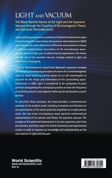 Light and Vacuum presents a synthesis of selected fundamental topics of electromagnetic wave theory and quantum electrodynamics (QED) and analyzes the main theoretical difficulties encountered to ensure a coherent mathematical description of the simultaneous wave–particle nature of light, put in evidence by the experiments. The notion and the role of the quantum vacuum, strongly related to light, are extensively investigated. Classical electrodynamics issued from Maxwell's equations revealed the necessity of introducing the notion of volume for an electromagnetic wave to stand entailing precise values of cut-off wavelengths to account for the shape and dimensions of the surrounding space. Conversely, in QED, light is considered to be composed of point particles disregarding the conceptual question on how the frequency of oscillating electric and magnetic fields may be attributed to a point particle. To conciliate these concepts, the book provides a comprehensive overview of the author's work, including innovative contributions on the quantization of the vector potential amplitude at a single photon state, the non-local simultaneous wave–particle mathematical representation of the photon and finally the quantum vacuum. The purpose of the advanced elaborations is to raise questions, give hints and answers, and finally aspire for further theoretical and experimental studies in order to improve our knowledge and understanding on the real essence of Light and Vacuum.