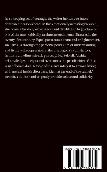 In a sweeping act of courage, the writer invites you into a depressed person's head. In this emotionally arresting memoir , she reveals the daily experiences and debilitating big picture of one of the most critically misinterpreted mental illnesses in the twenty-first century. Equal parts conundrum and enlightenment, she takes us through the personal pendulum of understanding and living with depression in the privileged circumstances. In this multi-dimensional, philosophical tell-all, Akshita acknowledges, accepts and overcomes the peculiarities of this way of being alive. A topic of massive interest to anyone living with mental health disorders, 'Light at the end of the tunnel..' stretches out its hand to gently provide solace and solidarity.