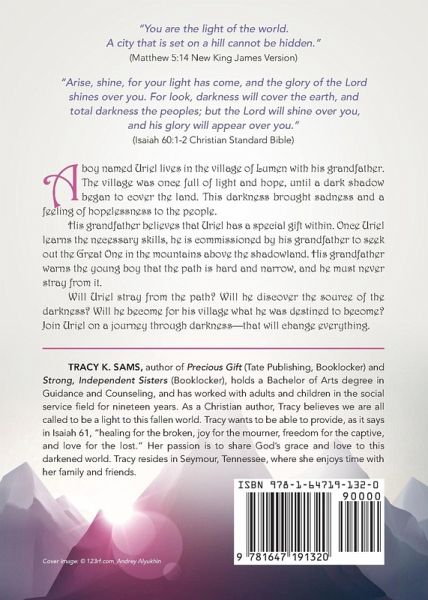 "You are the light of the world. A city that is set on a hill cannot be hidden." (Matthew 5:14 New King James Version) "Arise, shine, for your light has come, and the glory of the Lord shines over you. For look, darkness will cover the earth, and total darkness the peoples; but the Lord will shine over you, and his glory will appear over you." (Isaiah 60: 1-2 Christian Standard Bible) A boy named Uriel lives in the village of Lumen with his grandfather. The village was once full of light and hope, until a dark shadow began to cover the land. This darkness brought sadness and a feeling of hopelessness to the people. ¿ His grandfather believes that Uriel has a special gift within. Once Uriel learns the necessary skills, he is commissioned by his grandfather to seek out the Great One in the mountains above the shadowland. His grandfather warns the young boy that the path is hard and narrow, and he must never stray from it. Will Uriel stray from the path? Will he discover the source of the darkness? Will he become for his village what he was destined to become? Join Uriel on a journey through darkness-that will change everything.