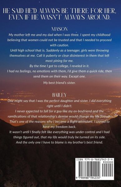 He said he'd always be there for her, even if he wasn't always around.. Mason My mother left me and my dad when I was three. I spent my childhood believing that women could not be trusted and that I needed to proceed with caution. Until high school that is. Suddenly as a teenager, girls were throwing themselves at me. Call it puberty or clear disinterest in them that left most pining for me. By the time I got to college, I had reveled in it. I had no feelings, no emotions with them, I'd give them a quick ride, then send them on their way. Except one. My best friend's sister. Bailey One might say that I was the perfect daughter and sister. I did everything right until I didn't. I never expected to fall for a guy like my ex-boyfriend and the ramifications of that relationship's demise would change my life forever. That's one of the reasons why I became a flight attendant. I craved to have my freedom back. It wasn't until I finally felt like everything was under control and that I had things figured out, that my life would truly be turned on its side. And the only one I have to blame is my brother's best friend.