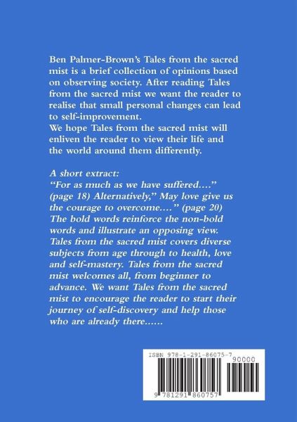 Ben Palmer-Brown's Tales from the sacred mist is a brief collection of opinions based on observing society. After reading Tales from the sacred mist we want the reader to realise that small personal changes can lead to self-improvement. We hope Tales from the sacred mist will enliven the reader to view their life and the world around them differently. A short extract: "For as much as we have suffered...." (page 18) Alternatively," May love give us the courage to overcome...." (page 20) The bold words reinforce the non-bold words and illustrate an opposing view. Tales from the sacred mist covers diverse subjects from age through to health, love and self-mastery. Tales from the sacred mist welcomes all, from beginner to advance. We want Tales from the sacred mist to encourage the reader to start their journey of self-discovery and help those who are already there......