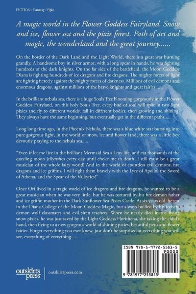A magic world in the Flower Goddess Fairyland. Snow and ice, flower sea and the pixie forest. Path of art and magic, the wonderland and the great journey...... On the border of the Dark Land and the Light World, there is a great war burning grandly. A handsome boy in silver armor, with a long spear in hands, he was fighting hundreds of the dark knights. On the far side of the battlefield, the Moon Goddess Diana is fighting hundreds of ice dragons and fire dragons. The mighty forces of light are fighting fiercely against the mighty forces of darkness. Millions of evil demons and enormous dragons, against millions of the brave knights and great fairies...... In the brilliant nebula sea, there is a huge Souls Tree blooming gorgeously in the Flower Goddess Fairyland, on this holy Souls Tree, every bud of soul will split in two light pixies and fly to different worlds, fall in different bodies, then growing and shining. They always have the same beginning, but eventually get in the different paths...... Long long time ago, in the Phoenix Nebula, there was a blue white star bursting into pure gorgeous light, "Even if let me live in the brilliant Mermaid Sea all my life, and eat thousands of the dazzling moon jellyfishes every day until choke me to death, I still must be a great musician of the whole fairy world! And in the world of countless evil demons, fire dragons and ice griffins, I will fight them bravely with the Lyre of Apollo, the Sword of Athena, and the Spear of the Valkyries!" Once Ori lived in a tragic world of ice dragons and fire dragons, he wanted to be a great musician when he was very little, but he was tortured by his fire demon father and ice griffin mother in the Dark Sunflower Sea Pixies Castle. At six years old, he got in the Diana College of the Moon Goddess Magic, but always bullied by his iceberg demon wolf classmates and evil siren teachers. When he nearly died in the flying snow pixies, he was just saved by the Light Goddess Florithe