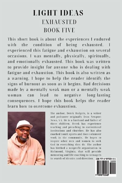 Light Ideas is a monthly devotional aimed as a daily practical guide to assist you in your daily search for the truth. You will be empowered to discover yourself and find the root source of your belief system. You will explore why you believe what you believe with scriptural guidance woven in. What causes you to feel what you feel? What is the source of your trigger? Designed for personal daily use. This short book is about the experiences I endured with the condition of being exhausted. I experienced this fatigue and exhaustion on several occasions. I was mentally, physically, spiritually, and emotionally exhausted. This book was written to provide insight for anyone who is dealing with fatigue and exhaustion. This book is also written as a warning. I hope to help the reader identify the signs of burnout as soon as it begins. Bad decisions made by a mentally weak man or a mentally weak woman can lead to negative long-lasting consequences. I hope this book helps the reader learn how to overcome exhaustion.
