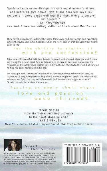 They say that madness is doing the same thing over and over again and expecting different results...but what happens when the very person that brought your heart back to life has the ability to shatter it with one confession? After an explosive affair left their hearts battered and scarred, Georgia and Tristan are trying for a fresh start. She is determined to take it slow and not repeat the mistakes of the past, while Tristan is willing to throw caution to the wind as long as he has his dark-haired girl in his life. But Georgia and Tristan can't shelter their love from the outside world, and the moments of exquisite passion they share aren't enough to sustain the relationship. When scars from the past resurface-will their hearts meld together as one? Or will outside forces tear them apart, leaving an empty shell where love and passion once thrived?